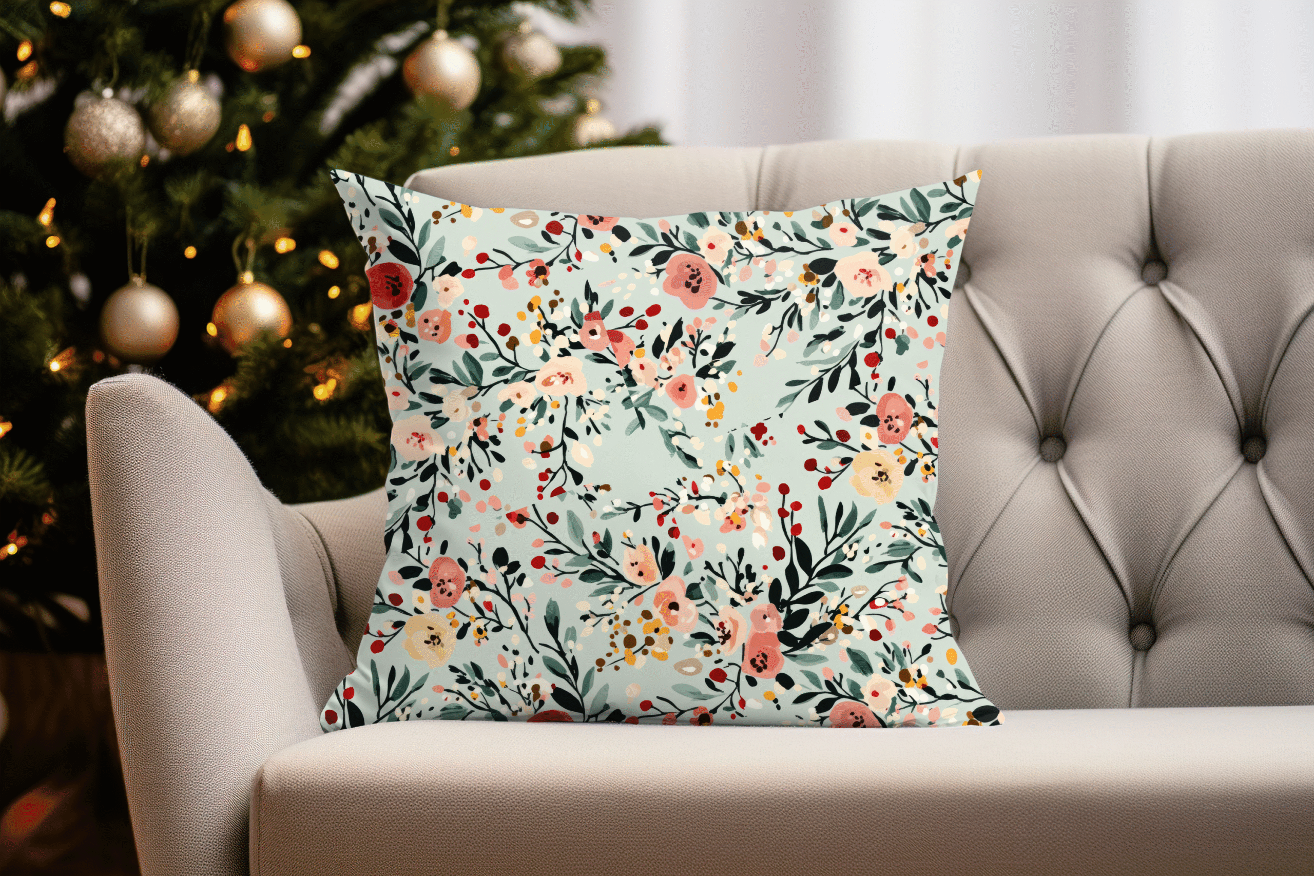 With hand-painted holiday berries, delicate buds, and leafy sprigs set against a soothing pale mint background, this pillow brings warmth and artistry to your dΓ©cor. Itβs festive enough to style for the holidays, yet subtle and floral enough to stay out all year long. Think: cottagecore Christmas meets cozy spring morning.