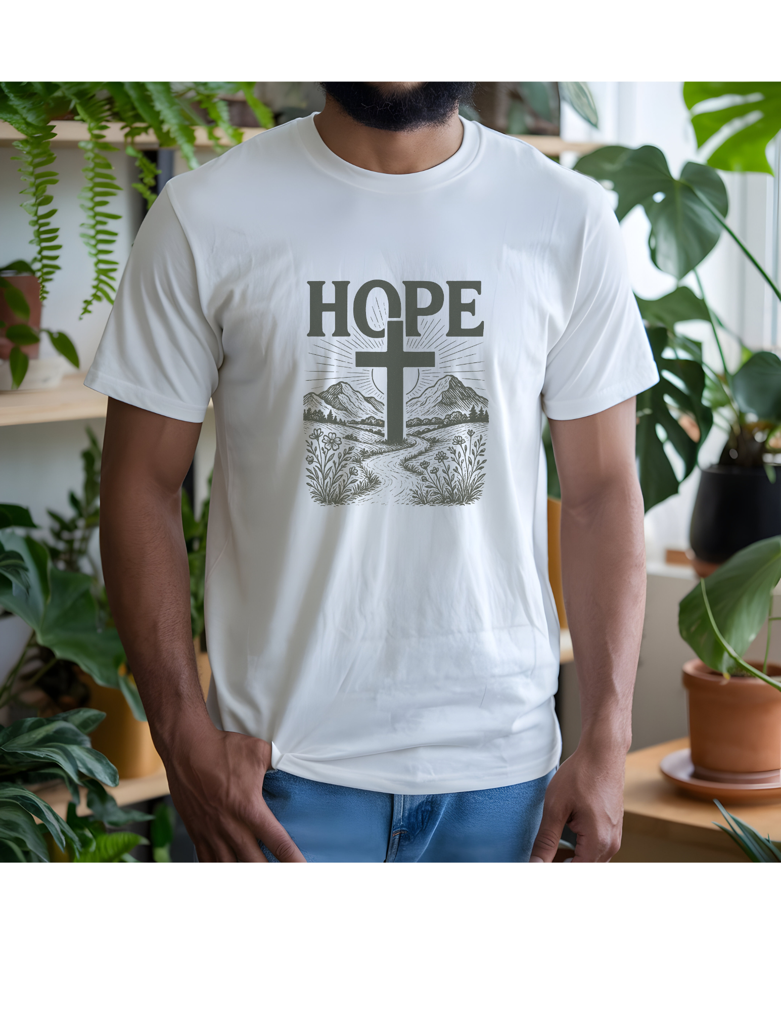 Hope Scenic Christian T-shirt is a trendy tee featuring the word HOPE with a cross, a walking path, a mountain view, and a sunrise. It’s a beautiful depiction of the hope the cross gives as we walk out our Christian faith, perfect for believers to spread hope one t-shirt at a time. Suitable for everyday wear and as gifts for men, women, teens, and preteens, ideal for holidays and occasions.