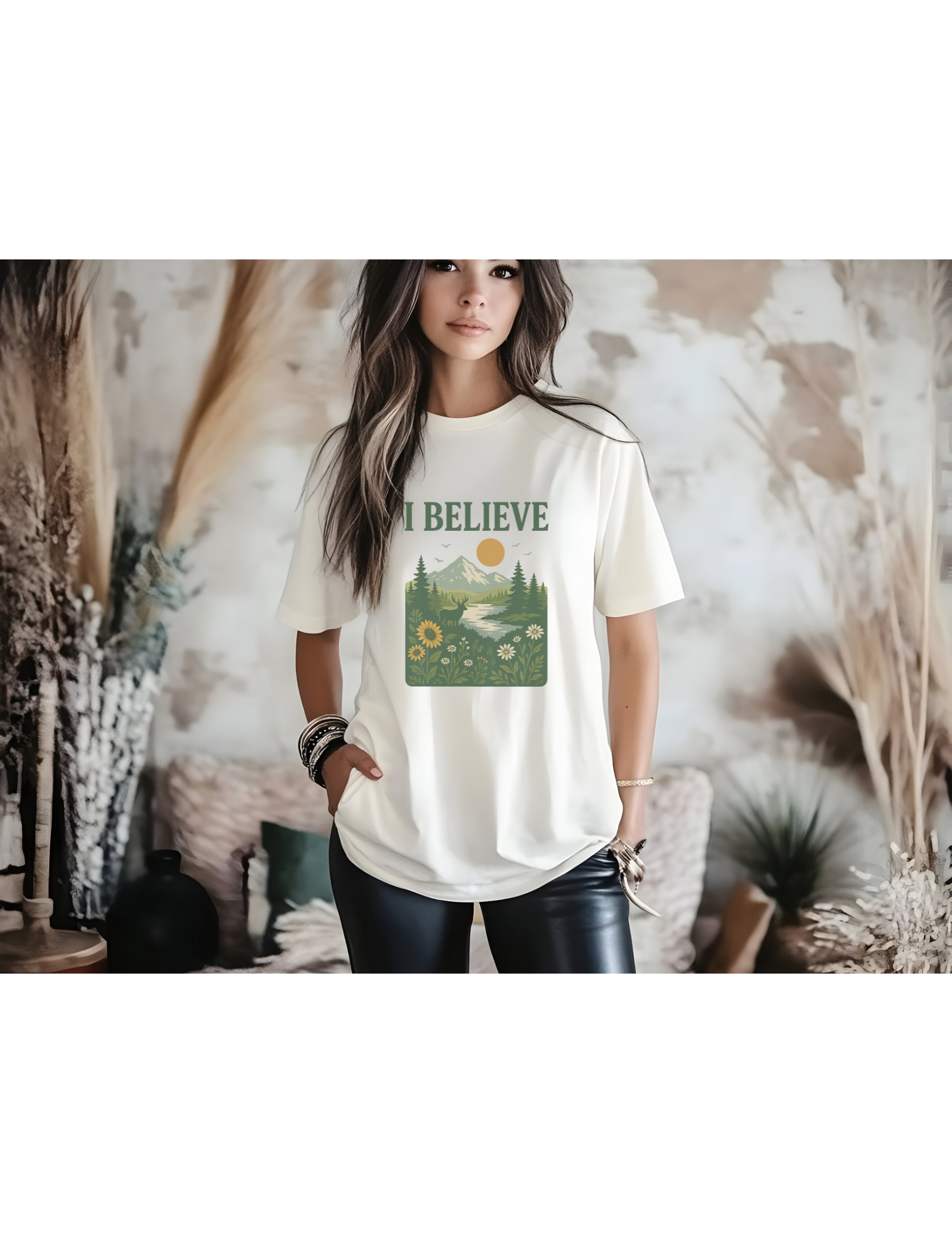 This Christian T-shirt features a beautiful flower meadow with mountains in the distance, perfect for those who like a stylistic graphic with a bold statement of I BELIEVE.  Ideal for women, teens, and preteens who want to express their faith. Perfect for running errands, church gatherings, school drop-off’s and everyday wear.