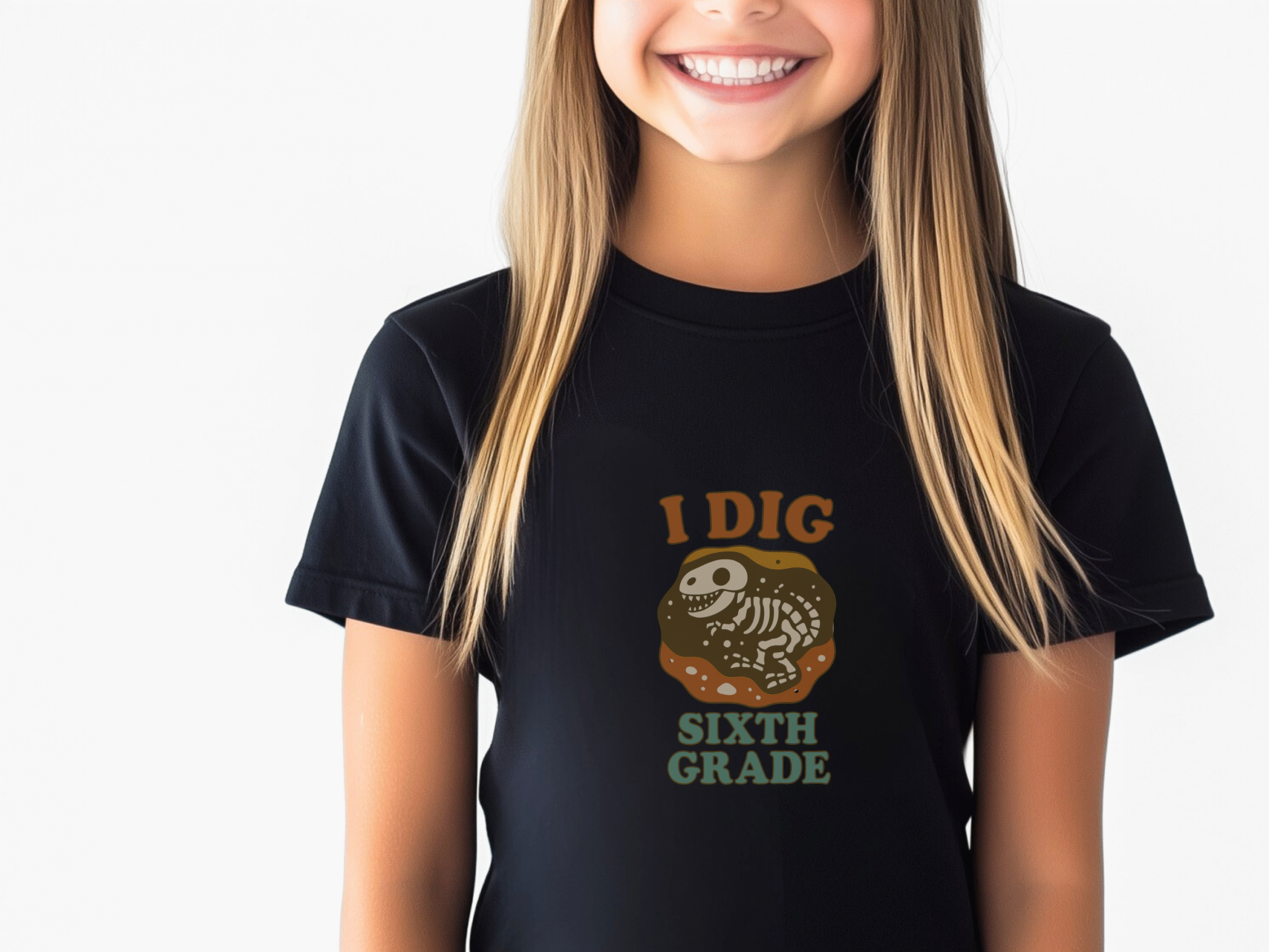 This I Dig 6th Grade tee is a trendy dino fossil graphic perfect for school wear, playtime, and everyday life. This comfortable cotton tee will be the talk of your child’s class, giving off a fun and cute vibe. Ideal for kids heading back to school or any dinosaur enthusiast. Make their last first-day-of-elementary roar-some!