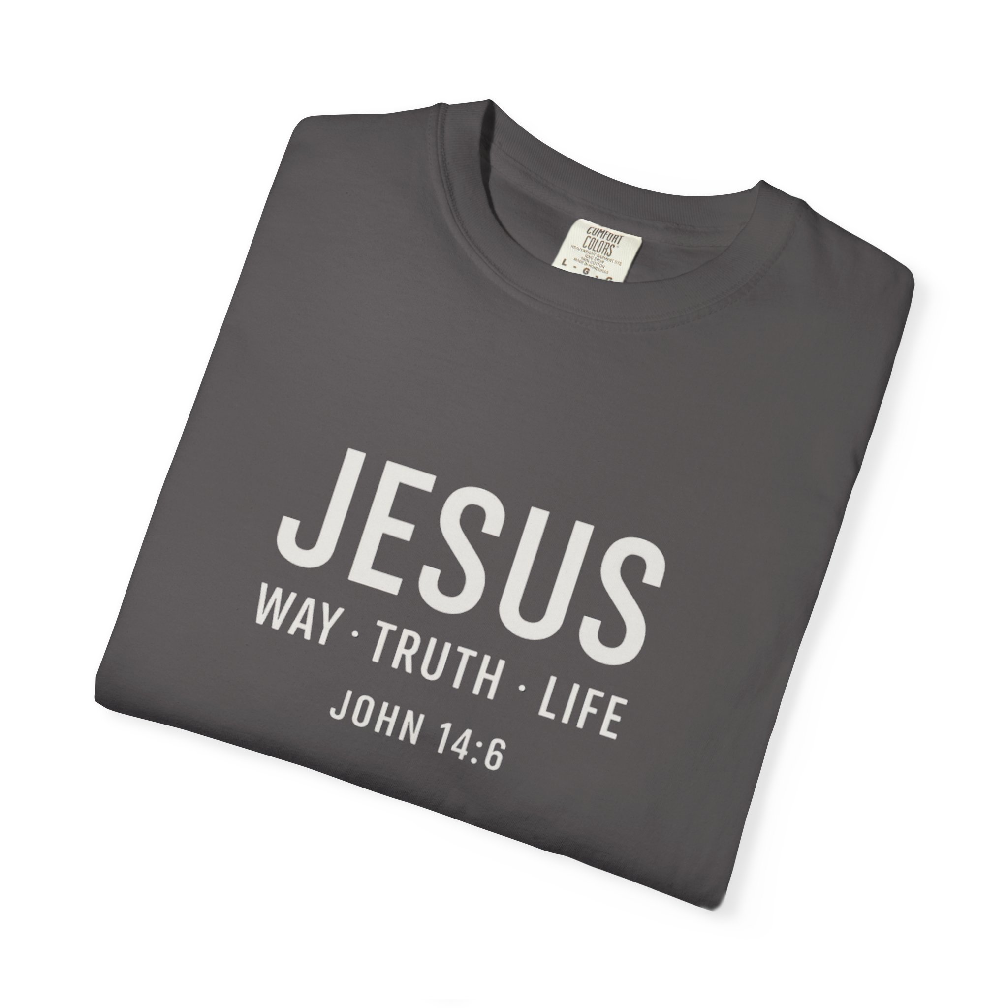 Jesus Way Truth Life John 14:16 Christian Faith Unisex Tee is a simple graphic tee with the Bible verse of John 14:16 printed in white lettering on a Comfort Colors dyed tee. This versatile tee is perfect for everyday wear, layering, or gifting to anyone looking to display their Christian faith. Suitable for men, women, teens, and preteens, this powerful tee speaks the truth!