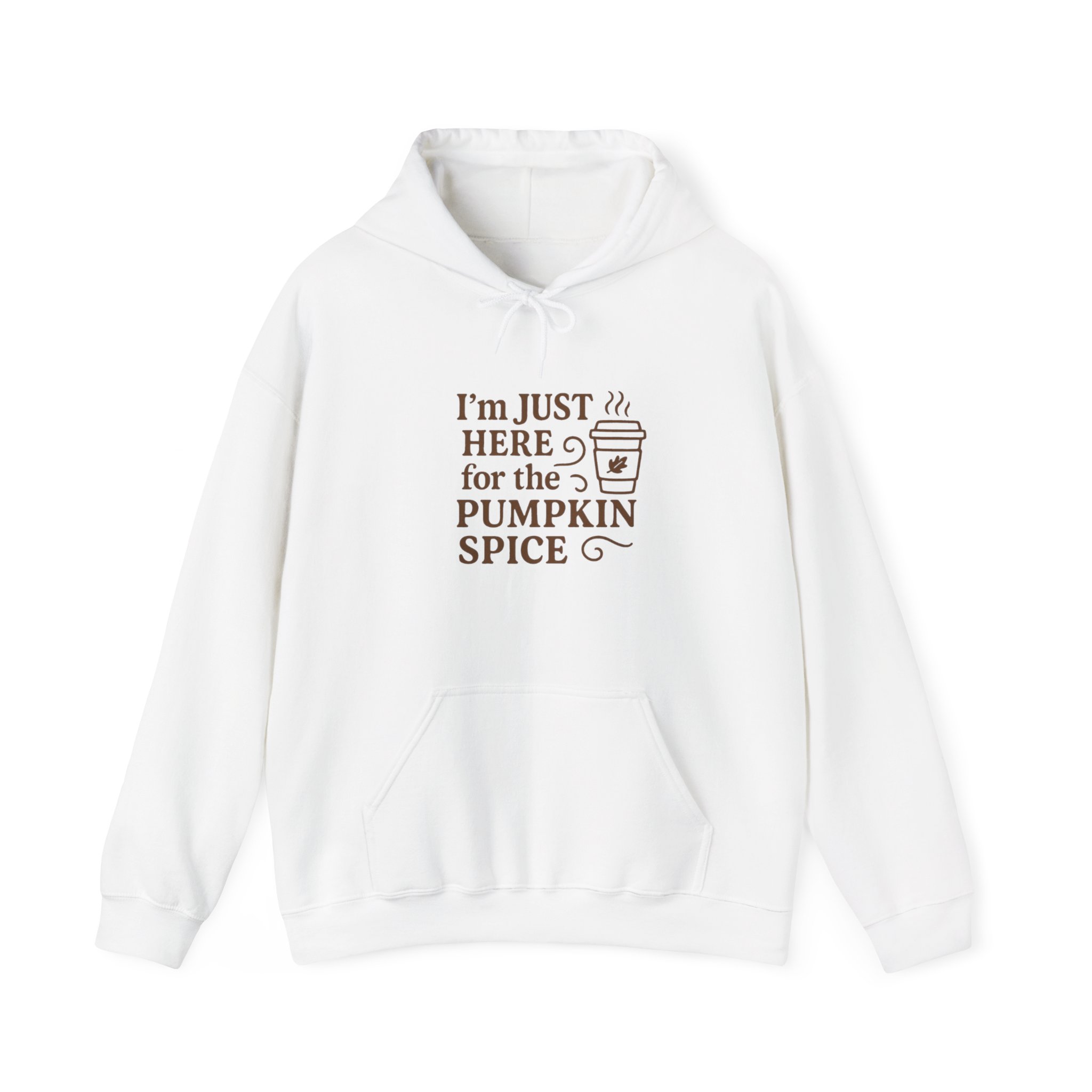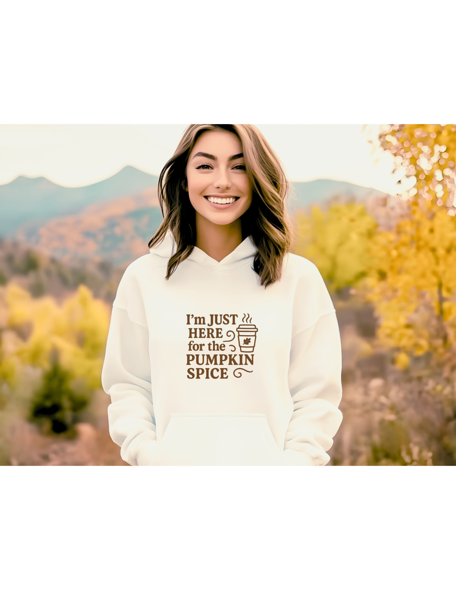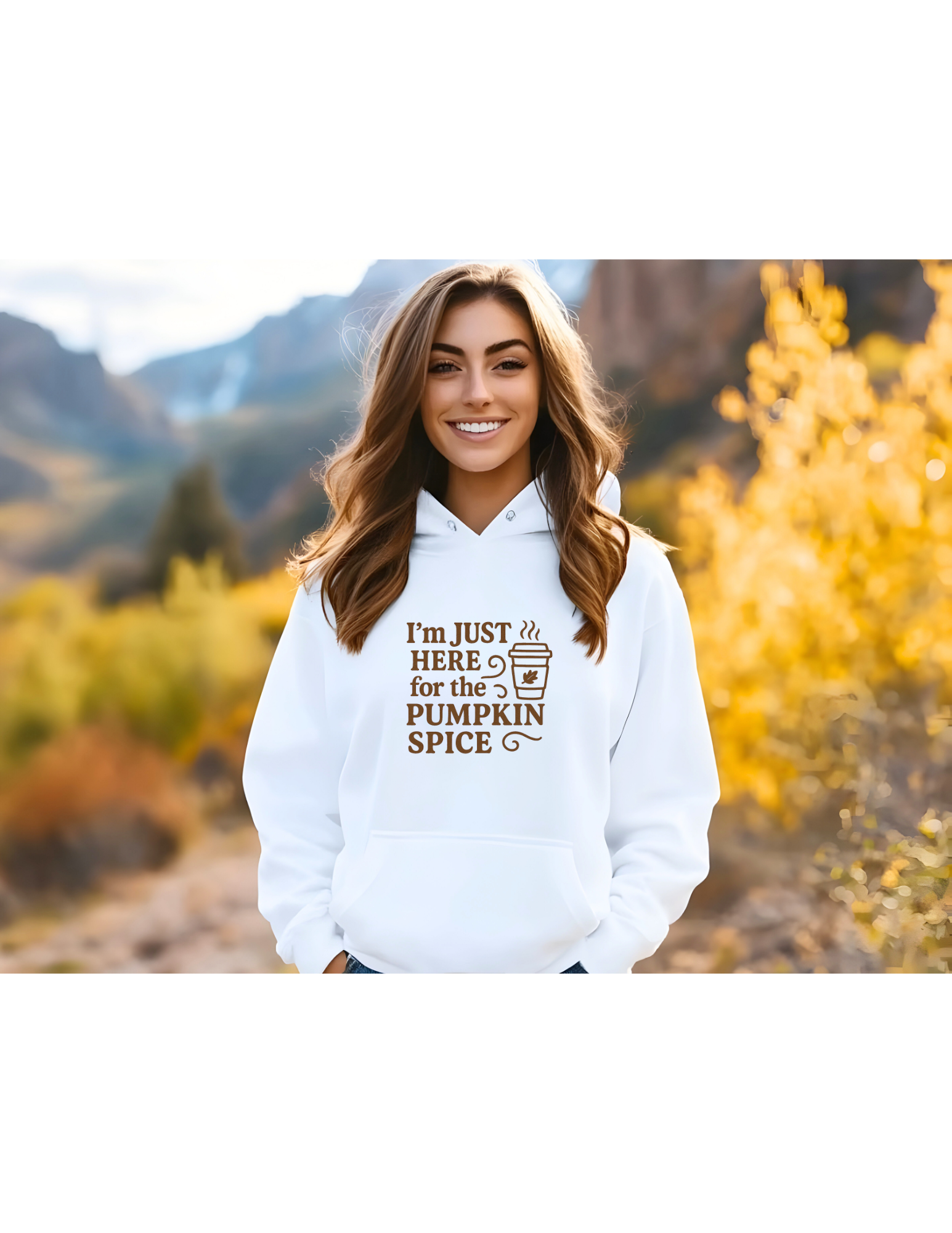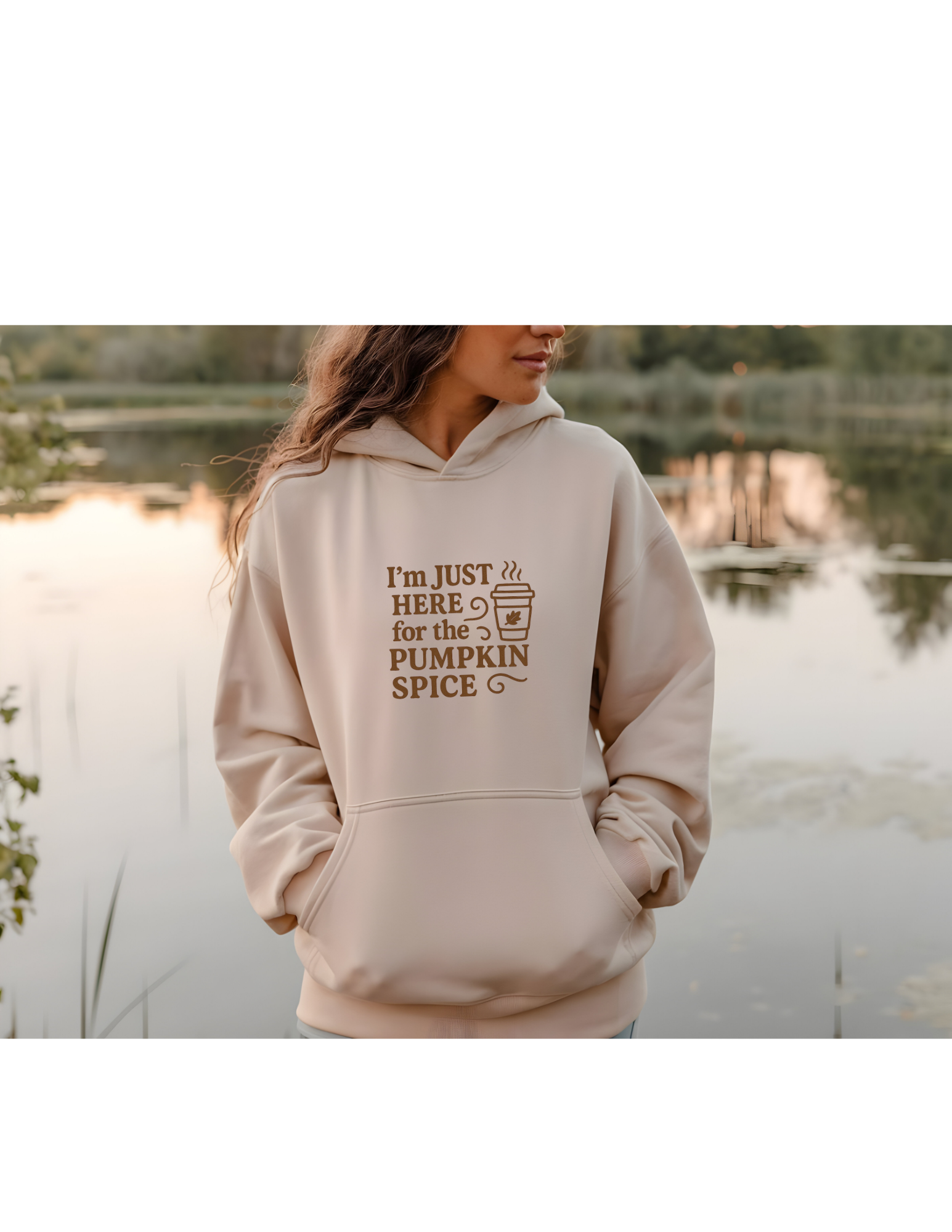 Our ‘I’m Just Here for the Pumpkin Spice’ Hoodie is perfect for fall. Featuring a viral trending simple graphic design with a simplistic feel, these hoodies are comfortable and stylish. Wear all year round because who doesn’t love pumpkin spice? Available in a variety of colors: white, ash, sand and sport grey, this hoodie is the perfect gift for yourself, your pumpkin spice loving friends, family members, co-workers, and neighbors. Ideal for fall, Halloween, Thanksgiving, and cozy autumn days.