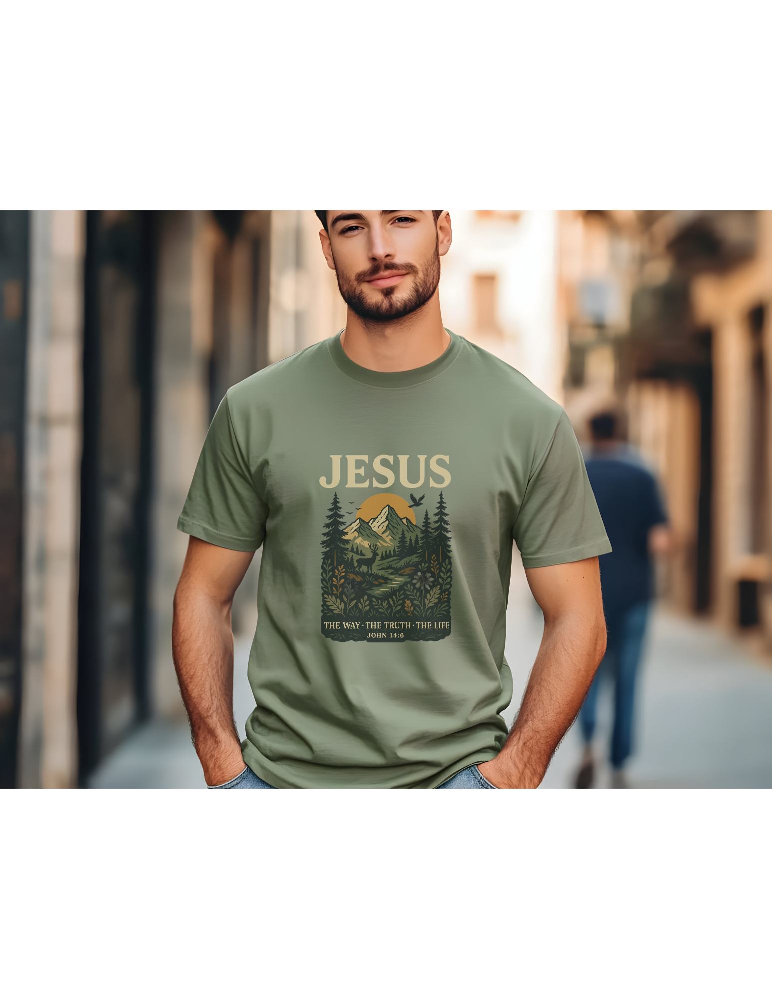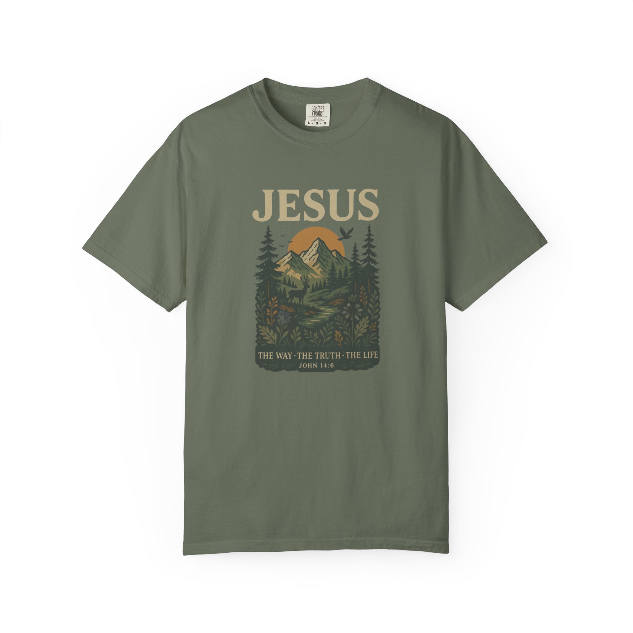 Jesus Way Truth Life John 14:16 Christian Faith Unisex Tee is a trendy scenic graphic tee with the Bible verse of John 14:16 printed in bold lettering on a Comfort Colors dyed tee. This versatile tee is perfect for everyday wear, layering, or gifting to anyone looking to display their Christian faith. With strong mountain feel, and toned down floral aspects, this outdoorsy tee is perfect for men, teens, and preteens! Express your faith out loud in a beautiful, artistic way!
