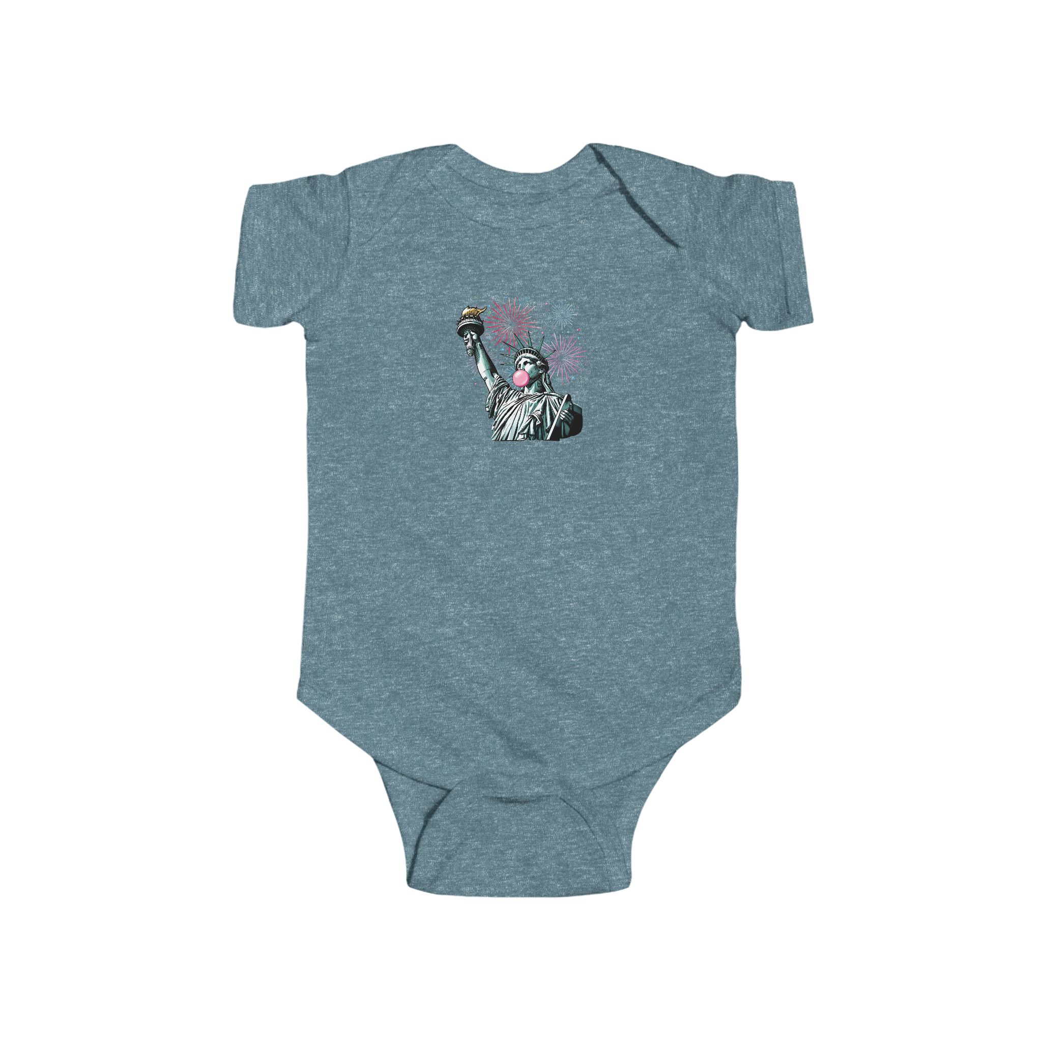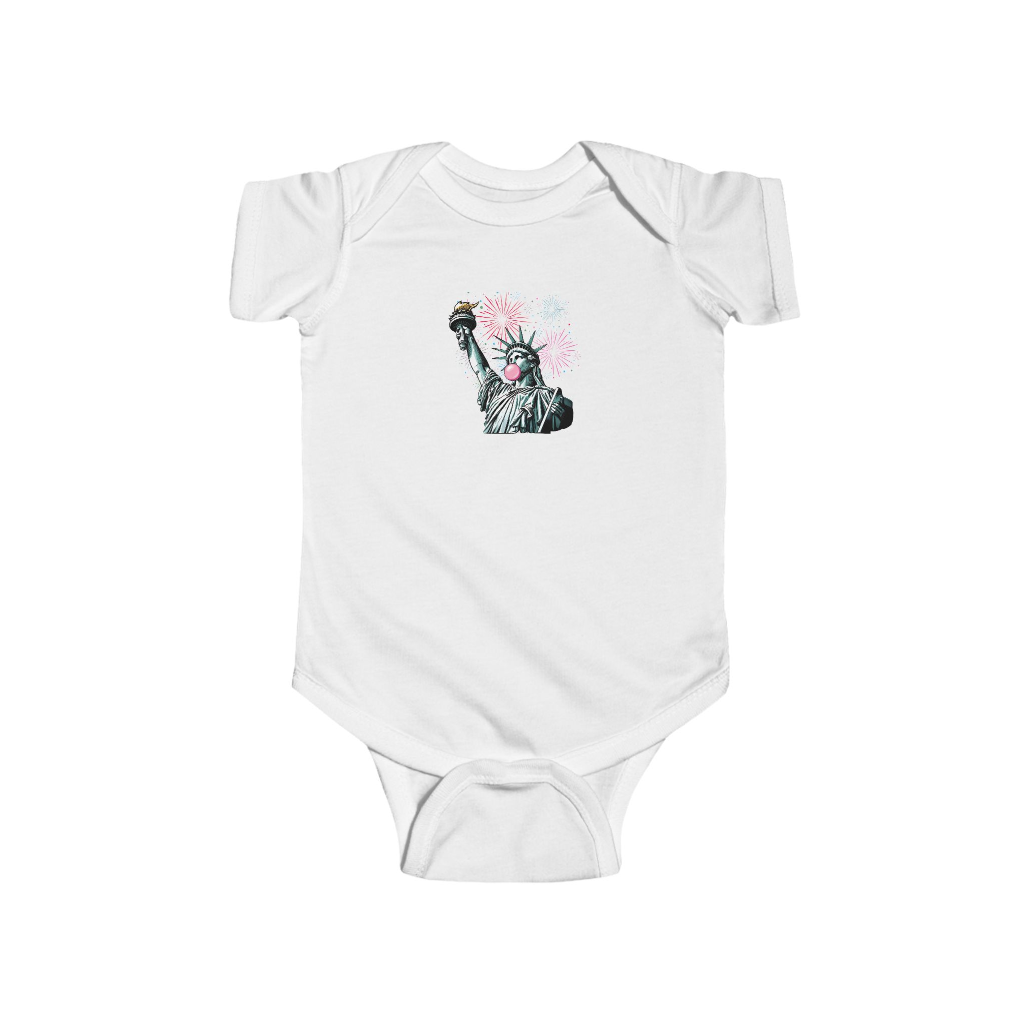 his adorable, one-of-a-kind onesie is sure to be the topic of conversations at any patriotic, or family, gathering! Perfect for all summer long, this onesie is comfortable and fun!Adorable Bubble Gum Statue of Liberty patriotic bodysuit for babies and toddlers, featuring a fun fireworks design behind Lady Liberty. Perfect for 4th of July, Memorial Day, summer celebrations, patriot babies, and everyday wear. Ideal for parents looking for cute and patriotic clothing for their little ones.