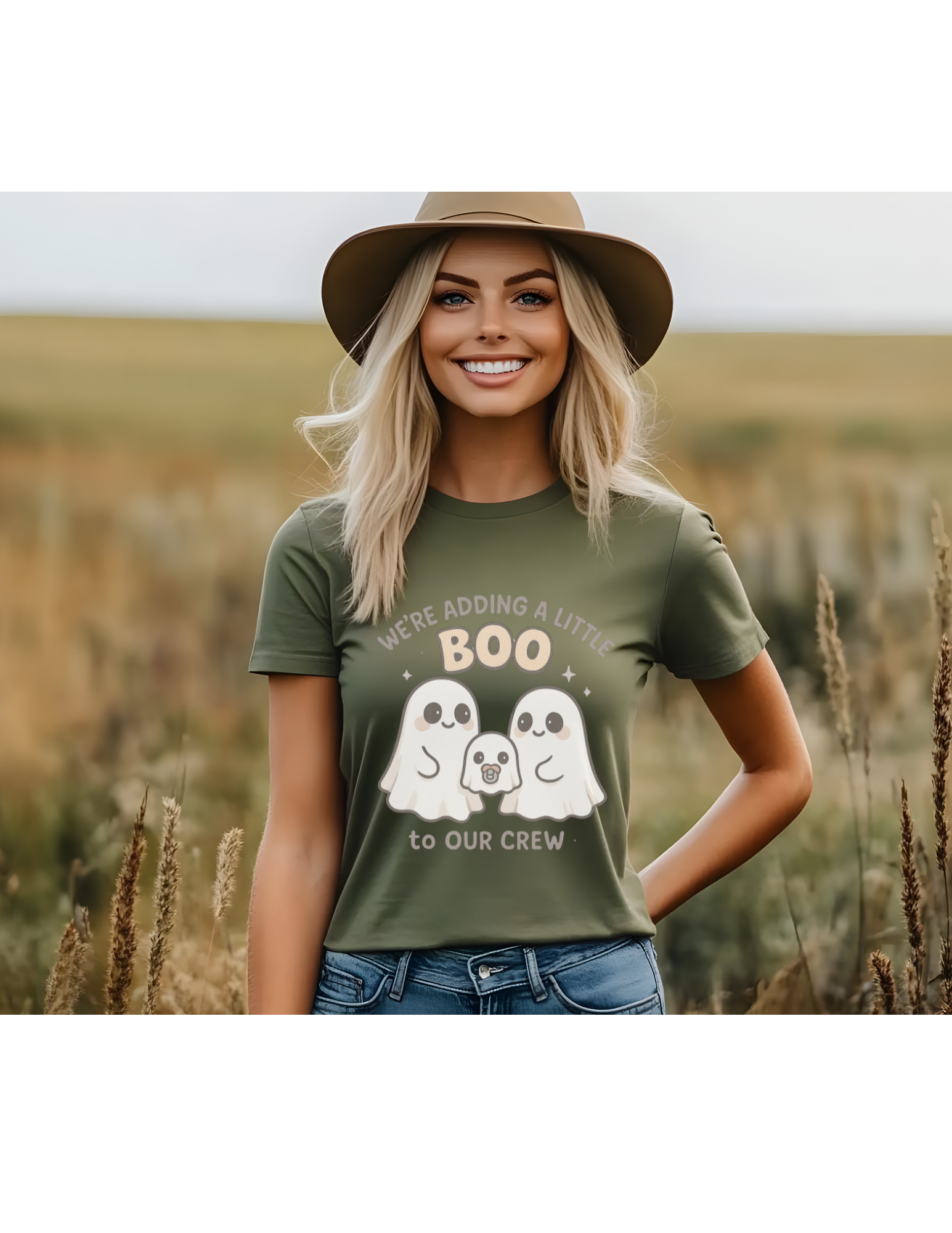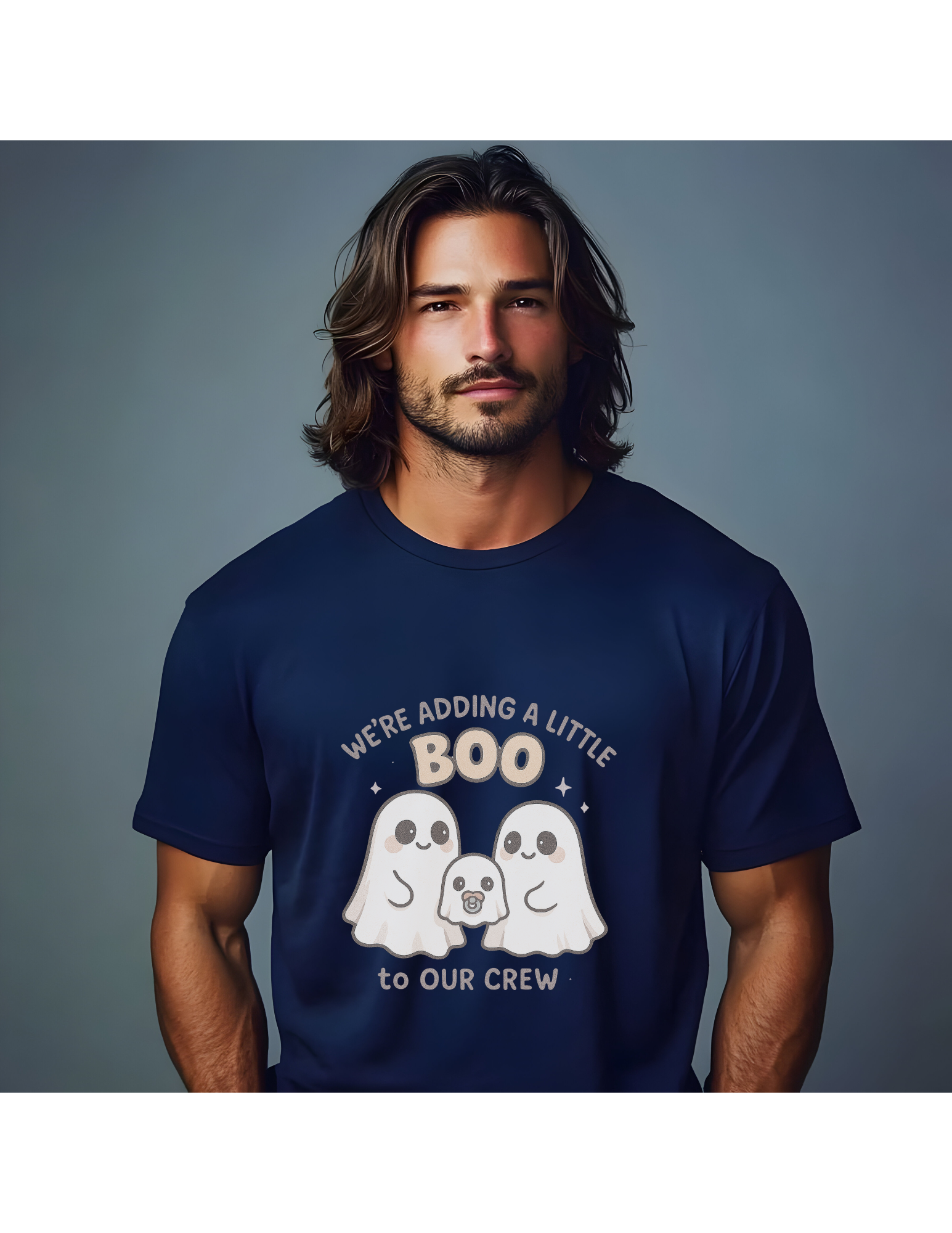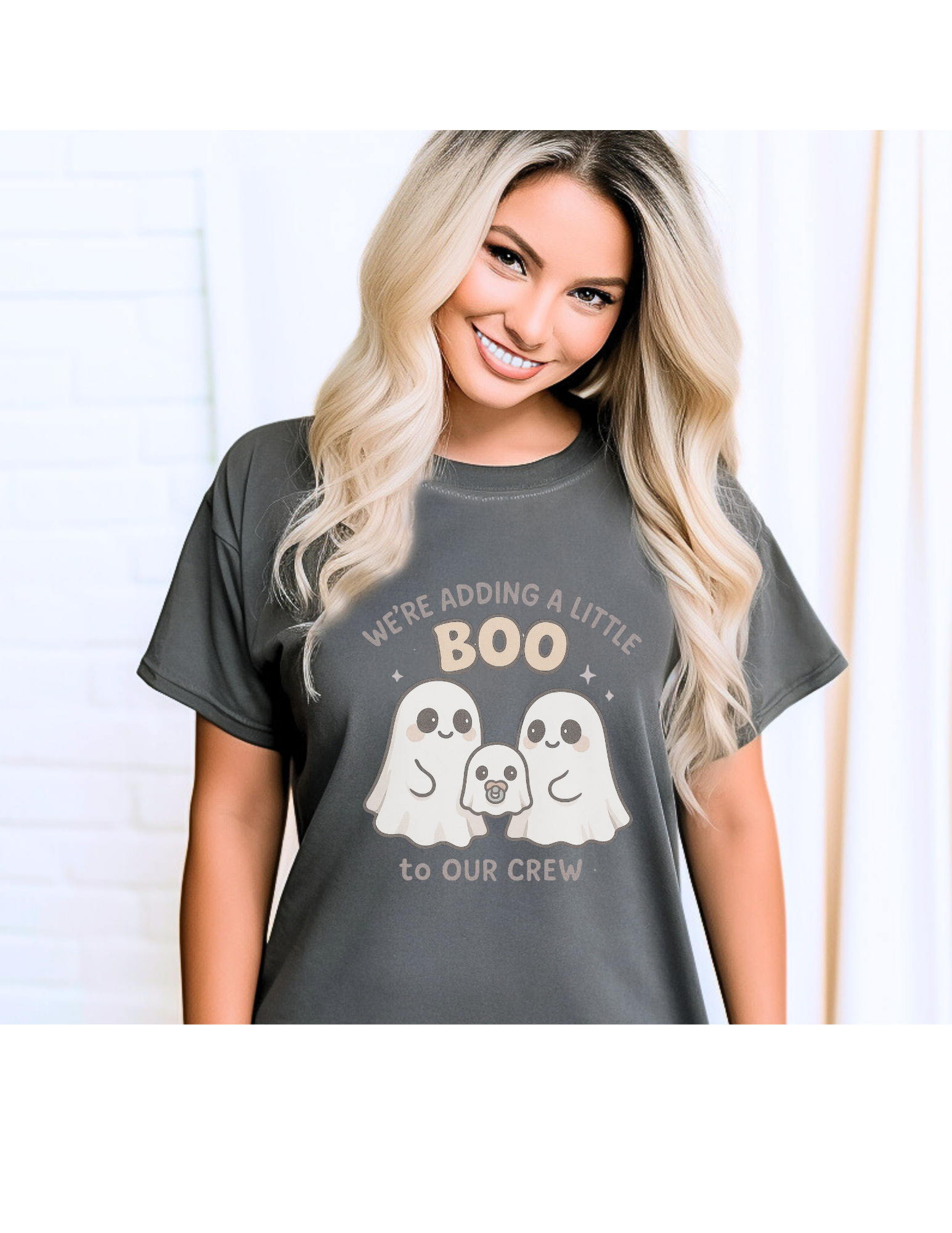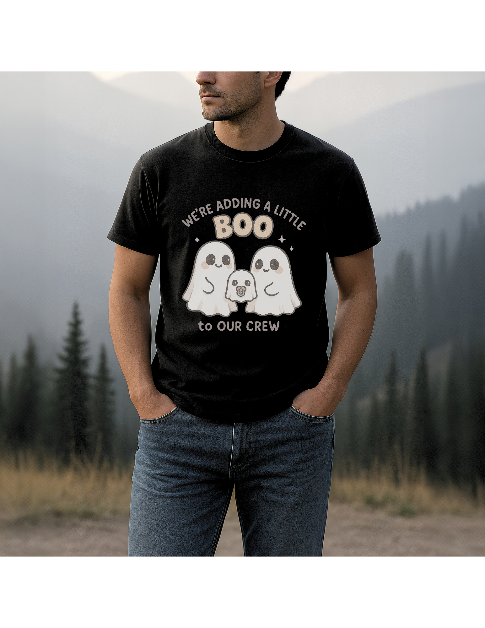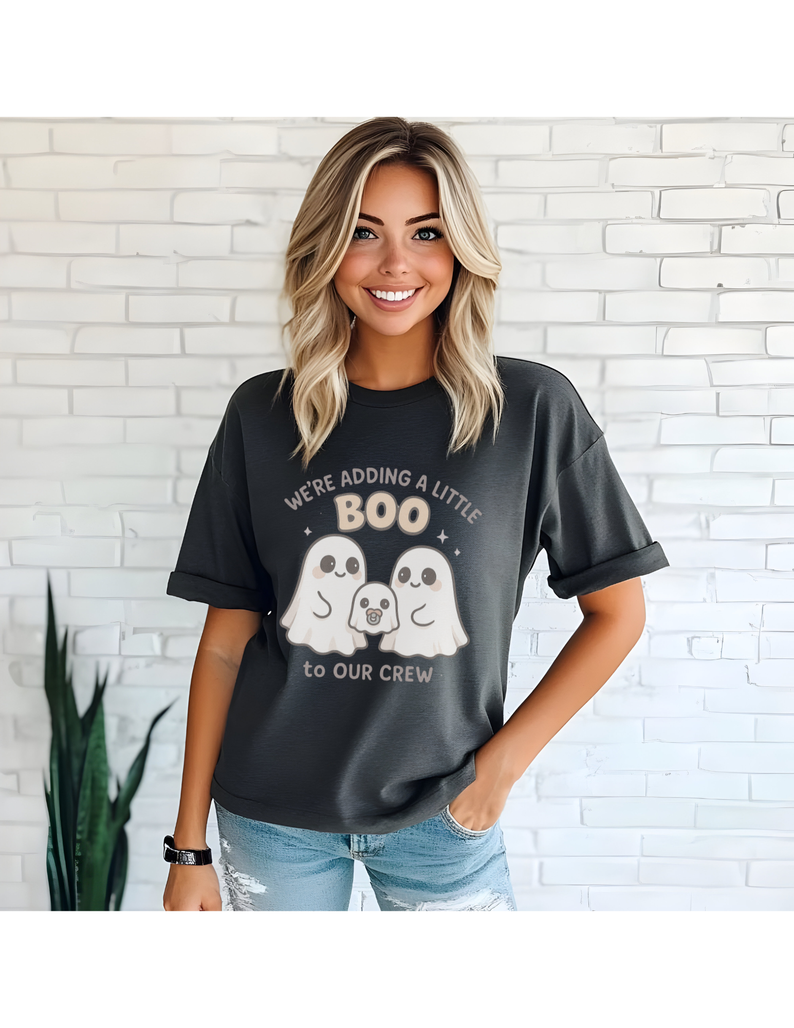 • 1 graphic t-shirt with “We’re Adding a Little Boo to Our Crew” design